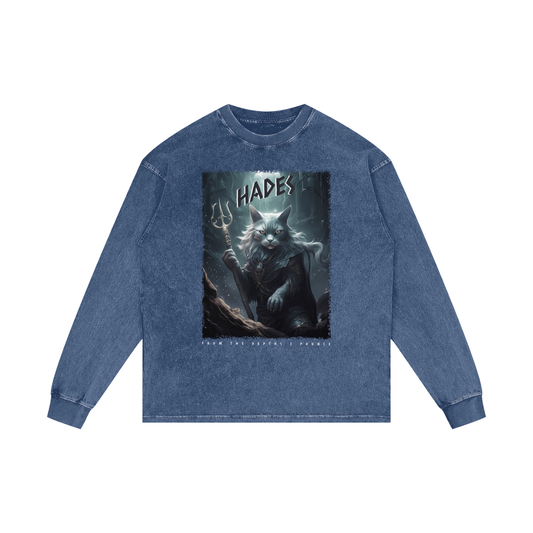 FROM THE DEPTHS I POUNCE, HADES, GREEK GOD CAT - Acid Wash Oversize Long Sleeve T-Shirt