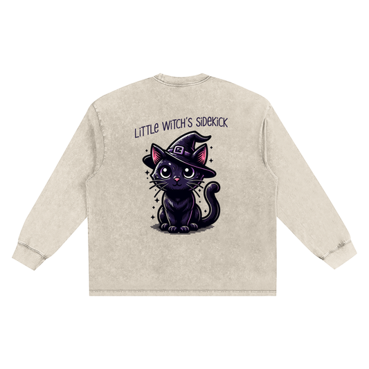 Halloween Little Witch's Sidekick Cat Acid Wash Oversize Long Sleeve T-Shirt