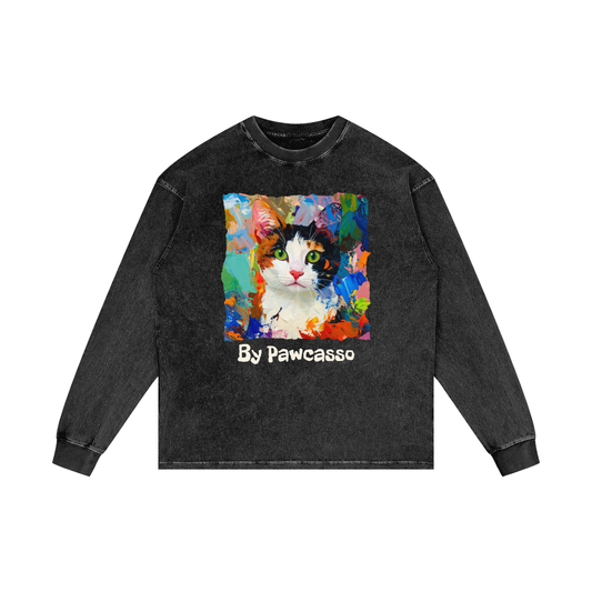 PAWCASSO PORTRAIT, CAT - Acid Wash Oversize Long Sleeve T-Shirt