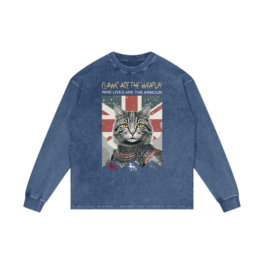 CLAWS ARE THE WEAPON, NINE LIVES IS THE ARMOUR. KNIGHT CAT - Acid Wash Oversize Long Sleeve T-Shirt