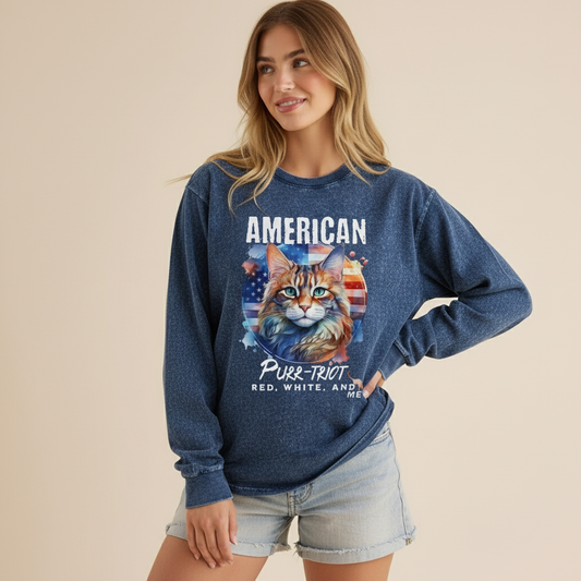 AMERICAN PURR-TRIOT. CAT - Acid Wash Oversize Long Sleeve T-Shirt in Blue & Black