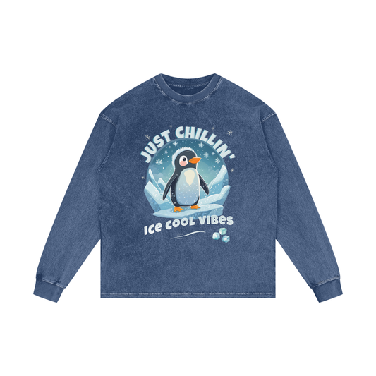 JUST CHILLIN’ PENGUIN - Acid Wash Oversize Long Sleeve T-Shirt