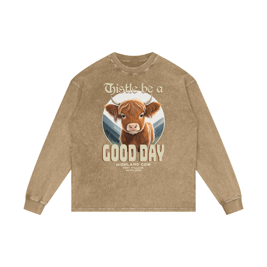 THISTLE BE A GOOD DAY, HIGHLAND COW - Acid Wash Oversize Long Sleeve T-Shirt