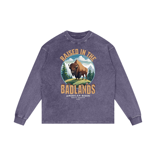 RAISED IN THE BADLANDS, BISON - Acid Wash Oversize Long Sleeve T-Shirt